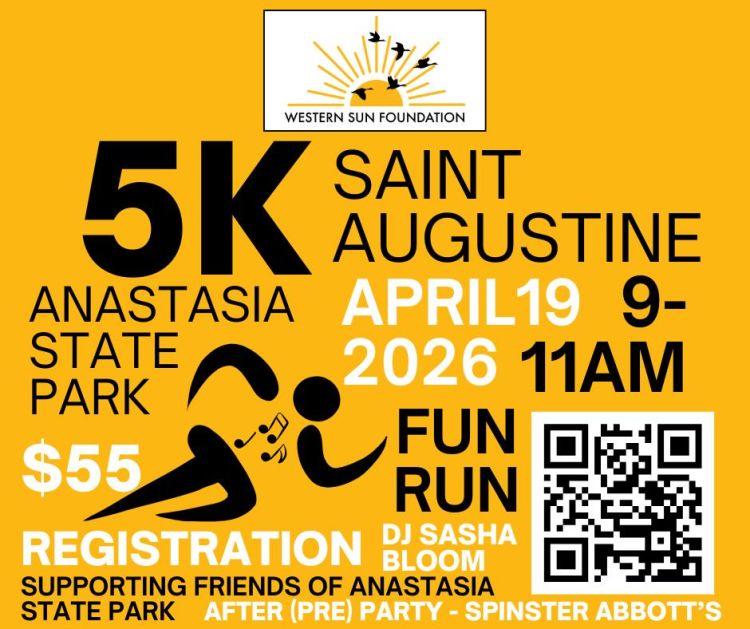 Join us in Anastasia State Park, just outside St. Augustine Amphitheatre, on Sunday, April 19, for a Fun Run! Registration will start at 9am with race time at 10am. This event is a Western Sun Foundation fundraiser, with proceeds benefiting Friends of Anastasia State Park . We’re excited to bring our community together for a morning of movement, connection, and good vibes in one of the most beautiful spots in St. Augustine. Expect fresh air, friendly faces, and a little bit of fun run shenanigans along the way.